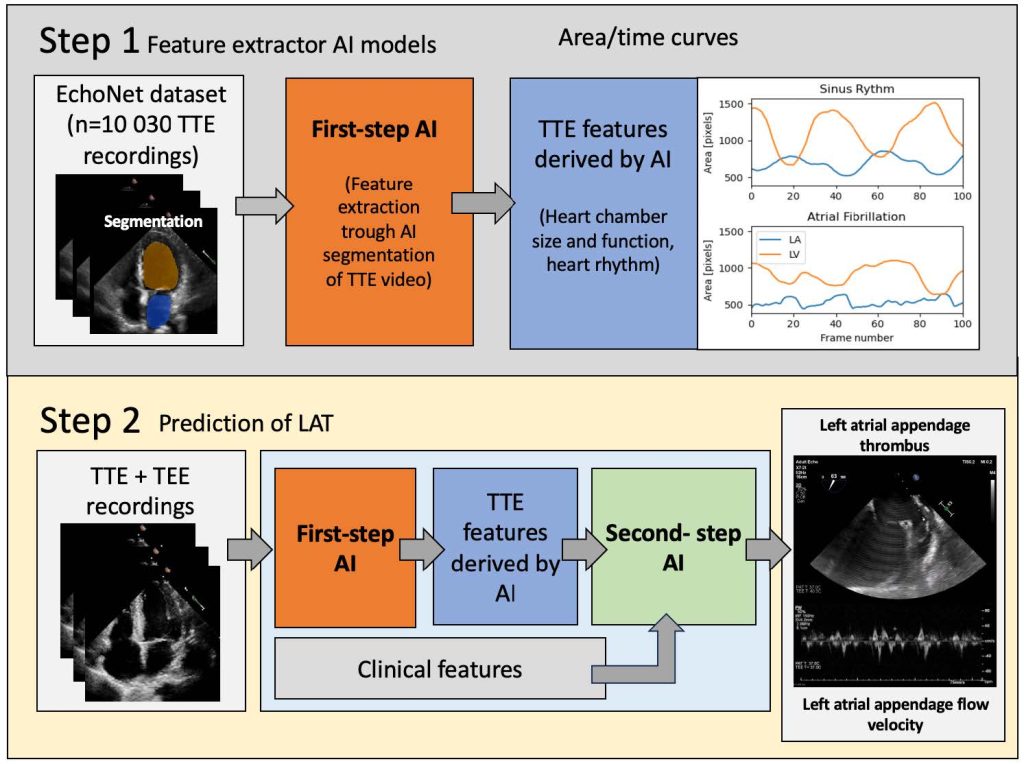W drugim etapie model integruje wygenerowane przez AI dane obrazowe z kontekstem klinicznym, obejmującym choroby współistniejące oraz farmakoterapię. Istotnym elementem projektu jest wykorzystanie uczenia maszynowego do jednoczesnej predykcji obecności skrzepliny (modele klasyfikacyjne) oraz szacowania prędkości przepływu w uszku lewego przedsionka (LAAV – modele regresyjne). LAAV jest kluczowym, ilościowym parametrem zastępczym (surogatem) ryzyka zakrzepowo-zatorowego , którego obecnie nie można zmierzyć lub oszacować za pomocą standardowego badania TTE i który dotychczas wymagał przeprowadzenia bardziej inwazyjnego badania przezprzełykowego (TEE).